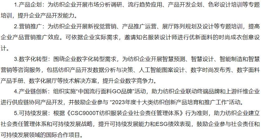 4.获奖产品将在2023年“大湾区国际纺织面料及辅料博览会”、“江苏(盛泽)纺织品博览会”、“广州国际轻纺城专场发布”、“宁波服装节”及“柯桥时尚周”等活动的中国纺织面料流行趋势发布区进行静态展示推广。