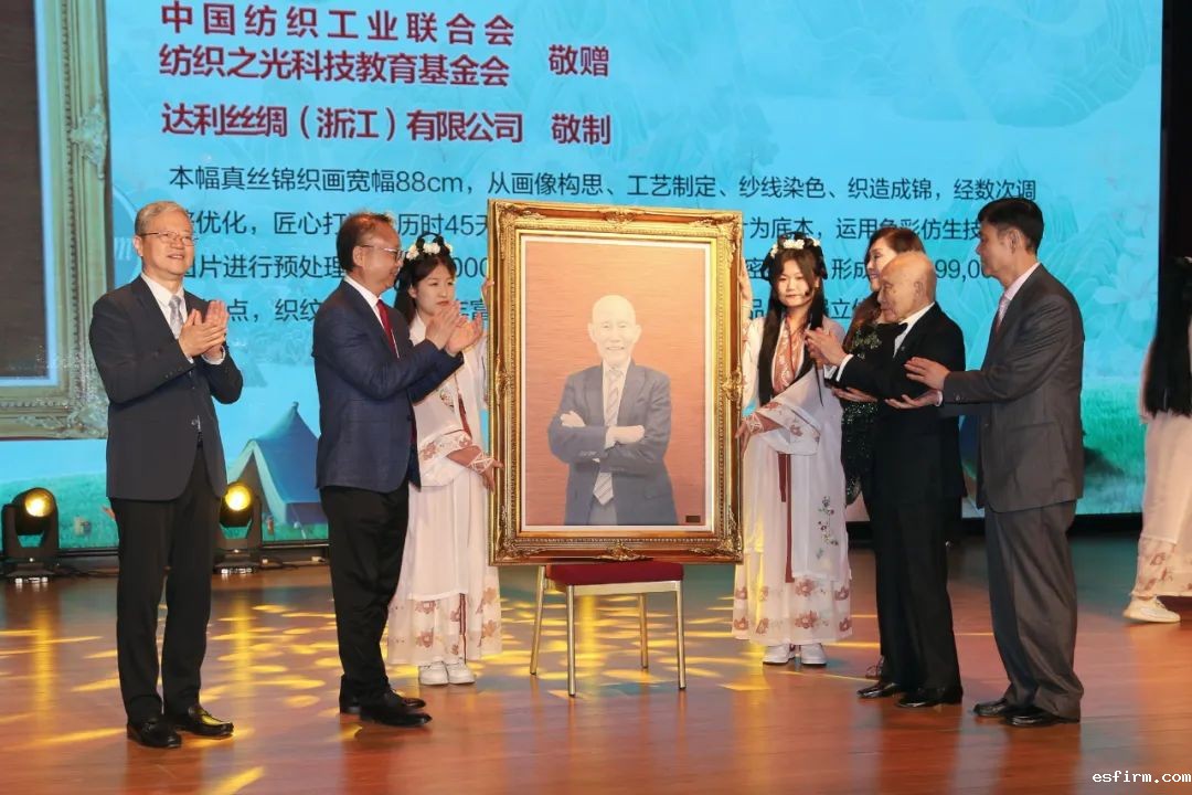 据悉,该贺礼是一幅真丝织锦郑敏泰肖像画,由达利丝绸(浙江)有限公司制作完成,幅宽达88厘米,从画像构思、工艺制定、纱线染色、织造成锦,经数次调整优化,匠心打造,共历时45天。作品运用了色彩仿生技术,对原版照片进行预处理,采用12000针大提花机进行织锦高精密织造,形成约3亿个交织点,织纹细腻、色感丰富、面料光泽柔美,整幅作品具有强立体感。匠心打造的贺礼,也是对郑敏泰先生一生致力于发展中国内衣事业表达最大的敬意。