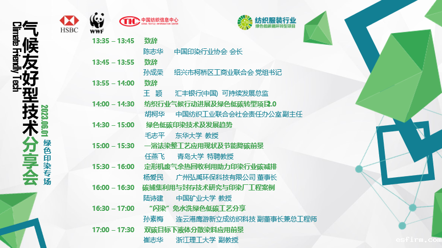 2023年6月1日,纺织服装行业气候友好型技术分享会[绿色印染专场]在绍兴市柯桥区顺利举办。此次技术分享会由伟德app官方正版下载地址社会责任办公室、中国印染行业协会和伟德app官方正版下载地址科技发展部主办,伟德客户端下载平台官网和国家纺织面料馆承办。为推动绿色低碳纺织产业发展、促进产业绿色清洁化转型提供科技支撑,HSBC汇丰银行和WWF世界自然基金会为本次活动提供支持。