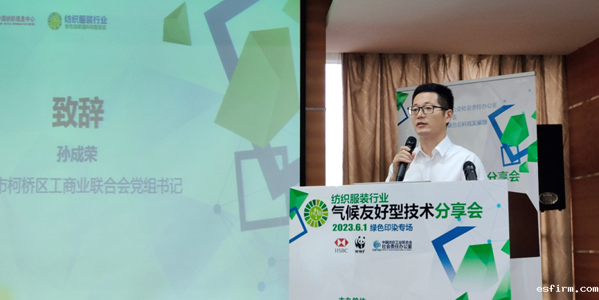 绍兴市柯桥区工商业联合会党组书记孙成荣先生在致辞中介绍,绍兴柯桥是纺织行业应对气候变化的先行者,也是全球首个发布碳中和愿景的纺织产业集群。他表示,柯桥拥有气候友好型技术创新与应用的沃土、关键支撑、广阔空间和政策保障。在未来,柯桥将秉持绿色发展理念,努力将柯桥打造成产业集群绿色发展的新样板。