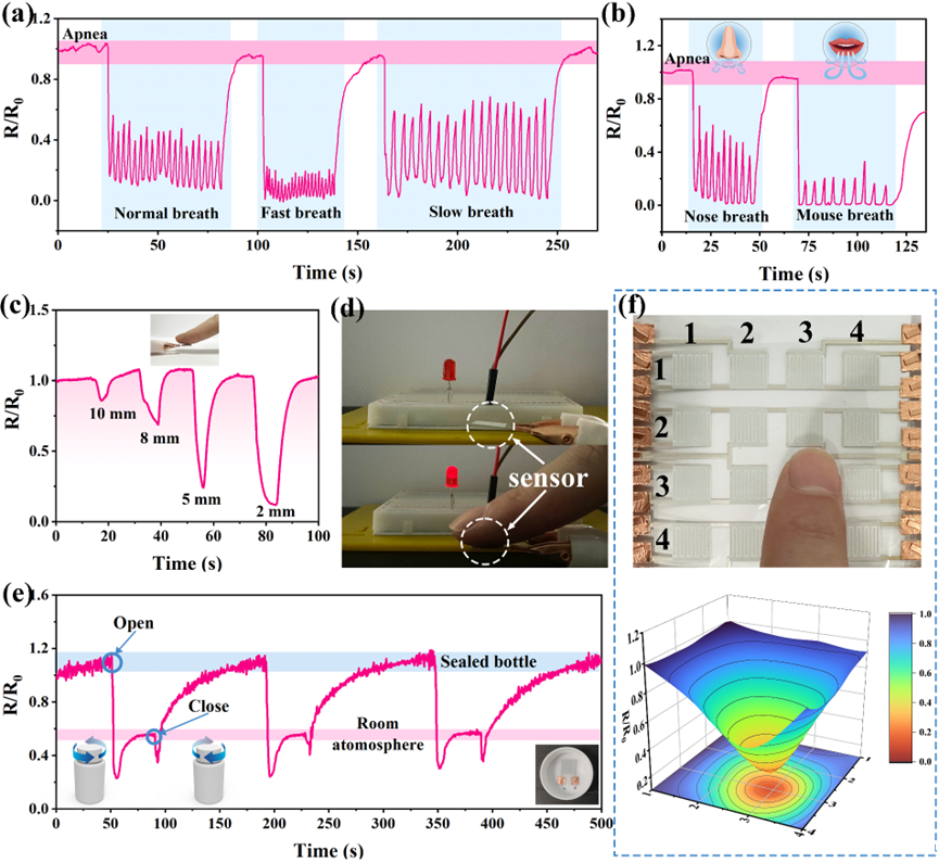 该团队通过实验设计合成了以晶面为主要生长和暴露晶面的六方相氧化钨纳米线,表现出更强的化学吸附能力和湿度敏感性,通过将其油墨化处理得到具有良好印刷适性的功能油墨,并采用丝网印刷技术在聚对苯二甲酸乙二醇酯基底表面上制备了电阻式柔性湿度传感器。所制备的柔性湿度传感器具有宽响应范围(11%~95% RH)、高灵敏度、较快的响应速度(1.5 s)和良好的循环稳定性,并展示了该传感器在人体呼吸频率监测、非接触式传感,以及药品包装开启监测等领域的多功能应用潜力。得益于丝网印刷的技术优势,还可以轻松的通过改变湿度敏感层和叉指电极层的制备参数调控湿度传感器的性能,以满足特定应用的不同要求。