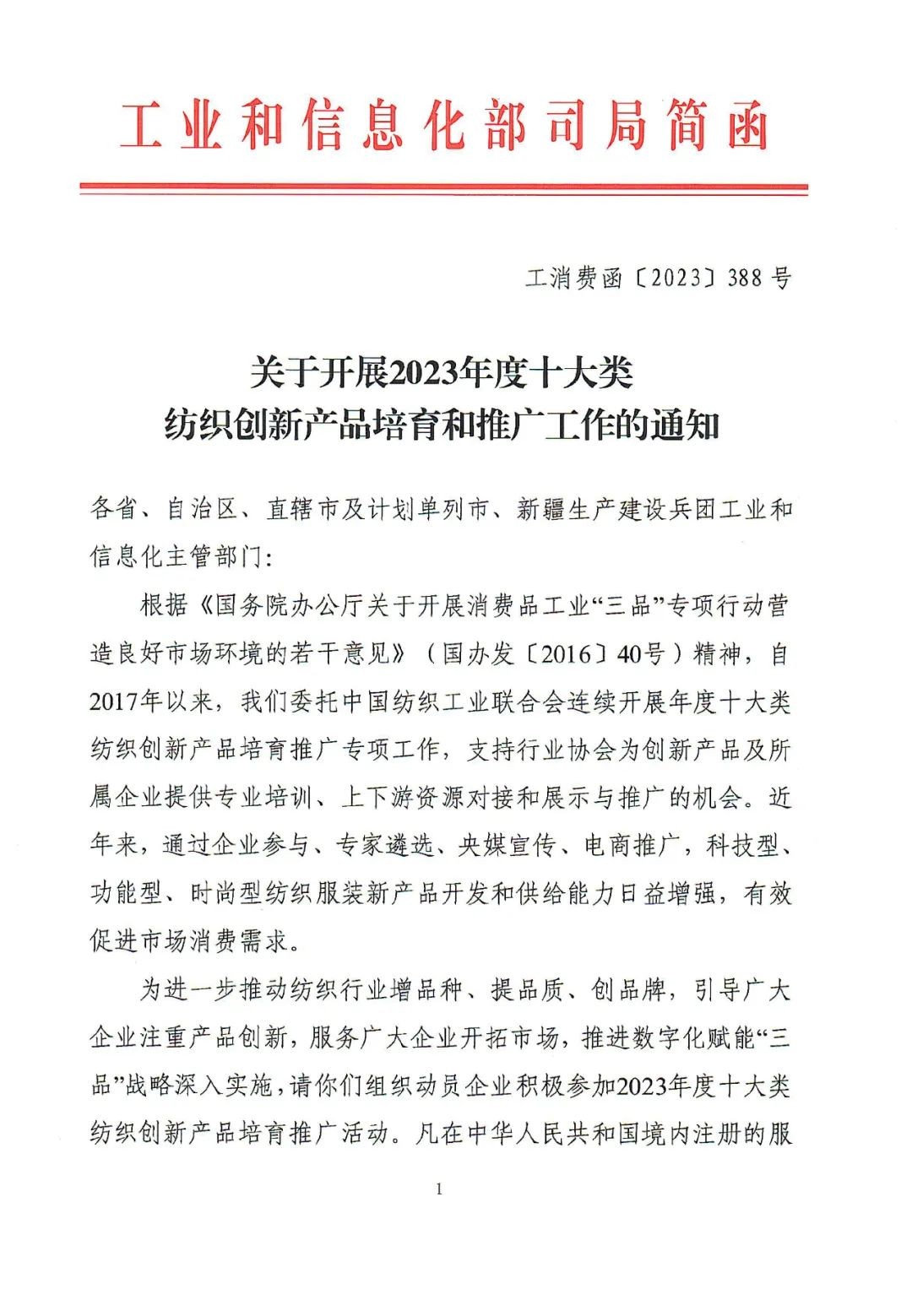 为进一步推动纺织行业增品种、提品质、创品牌,引导广大企业注重产品创新,服务广大企业开拓市场,工业和信息化部消费品工业司下发了“关于开展2023年度十大类纺织创新产品培育和推广工作的通知”。网上申报工作将于8月1日截止。