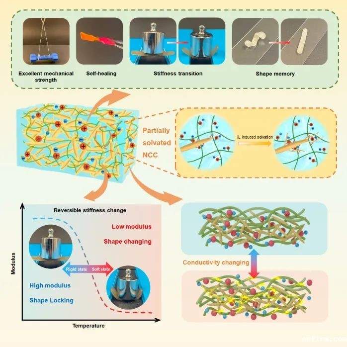 近日,天津大学和加拿大滑铁卢大学的研究团队联合研究利用离子液体(IL)部分溶解纤维素纳米晶(NCC)和聚合物网络结合的策略,制备了具有强机械性能,形状记忆功能,热响应刚性及导电性转变的纤维素纳米晶离子凝胶。