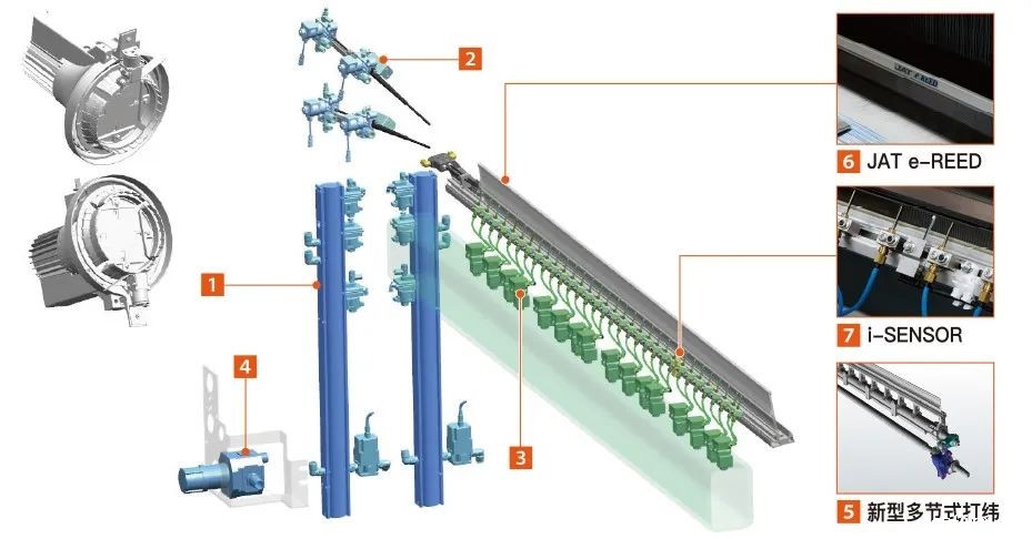 对于织机而言,生产速度和效率决定了产品的产量和质量,合适的运转速度和持续平稳的高质量运行是衡量其发展水平的重要指标,也是为织造企业增加产量和效益的重要方式。本届展会上,各家企业纷纷在高速高效方面进行优化提升,织造装备的高速化、高效率优势得以延续。在开口装备方面,史陶比尔的超高速S3280电子旋转多臂,最高转速可以达到1 580 r/min,能够匹配高速运行的喷气织机;剑杆织机的工作幅宽和速度均有所提高,意达的牛仔剑杆织机Ultimax-4-R-220在织造幅宽为220 cm时的转速可达730 r/min,丝幂拓的CONCEPT190C8 D剑杆概念机在织造幅宽为190 cm时的转速可达800 r/min;喷气织机通过对合理的主喷嘴与辅助喷嘴、气流引纬场的设计,速度也有所提升,津田驹的ZAX001neo-190-2C-Cam喷气织机采用积极式凸轮打纬,在织造幅宽为190 cm时的转速可达1 200 r/min,丰田的JAT910 2S-340LM-ET在织造幅宽为340 cm时的转速可达900 r/min。但总体来看,与上届展会的展出装备相比,织造装备速度的提升非常“理性”,设备制造商更注重在高速基础上的稳定性、品种适用性和运行的可靠性。