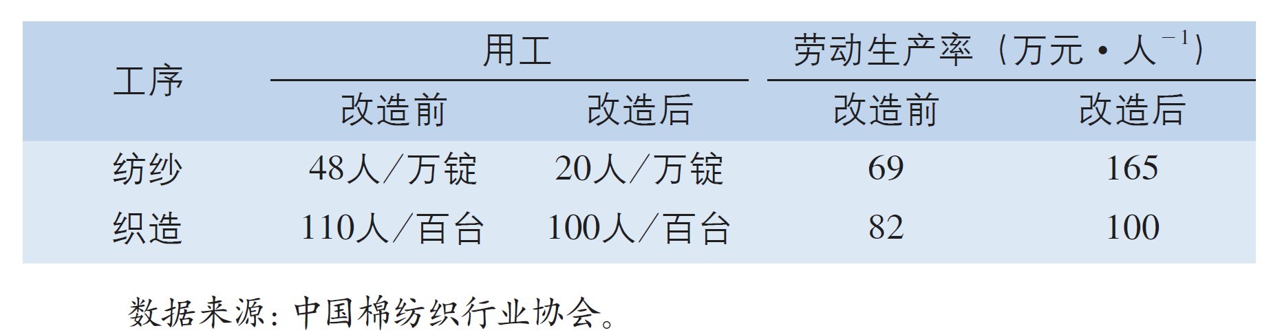 随着劳动力成本的快速上升,企业更加倾向于用机器替代人,用大数据分析系统替代传统的数据统计工作。以纺纱为例,继清梳联装备普及后,细络联、粗细络联、自动打包机的技术日益成熟,并粗工序也逐步在企业应用。典型案例显示,在自动化技术的推动下,常规产品的万锭用工可下降70%,一台自动穿经设备可替代15个工人。棉纺织产业的智能制造实践,大幅减少了用工量,也降低了操作工的劳动强度。
