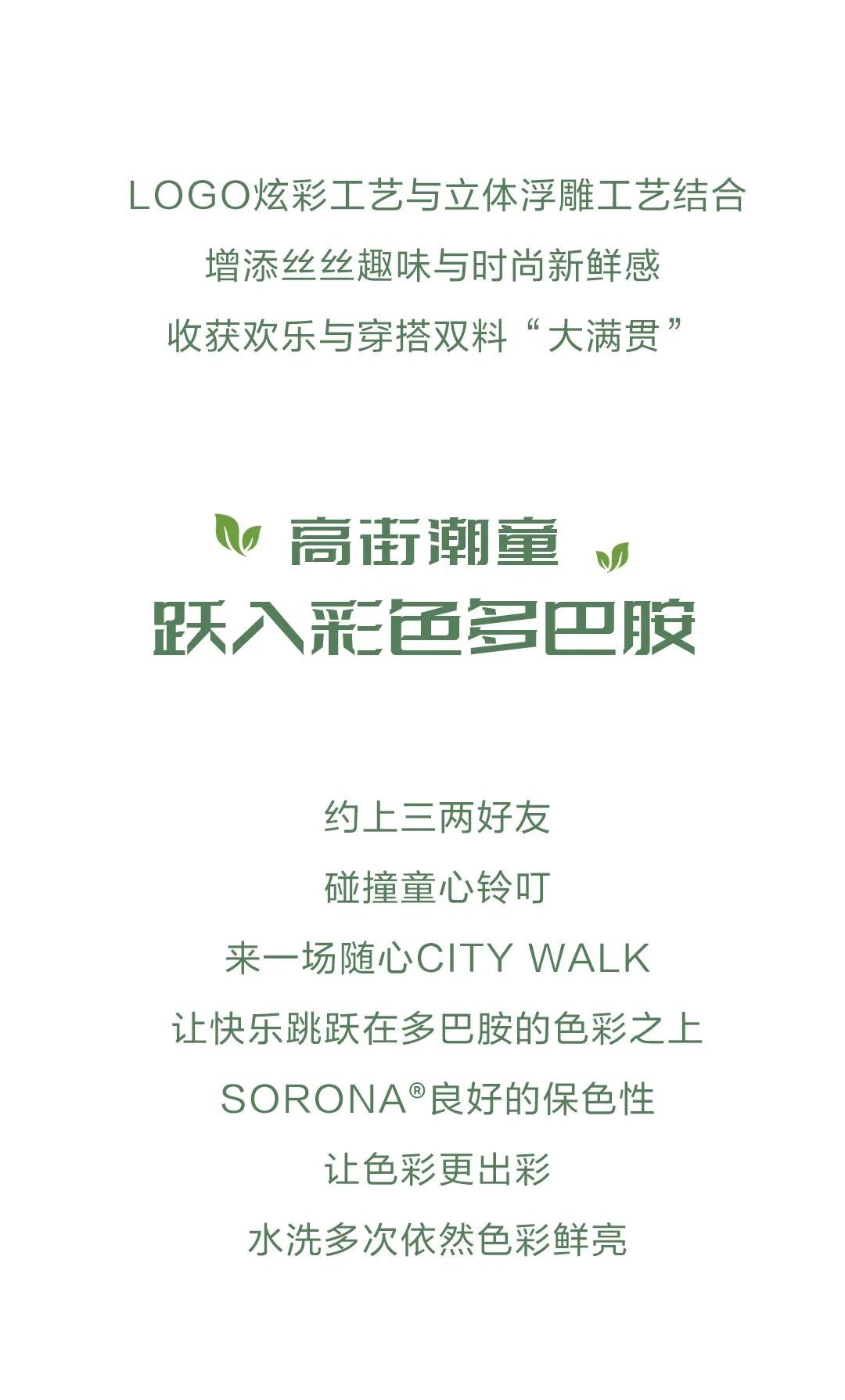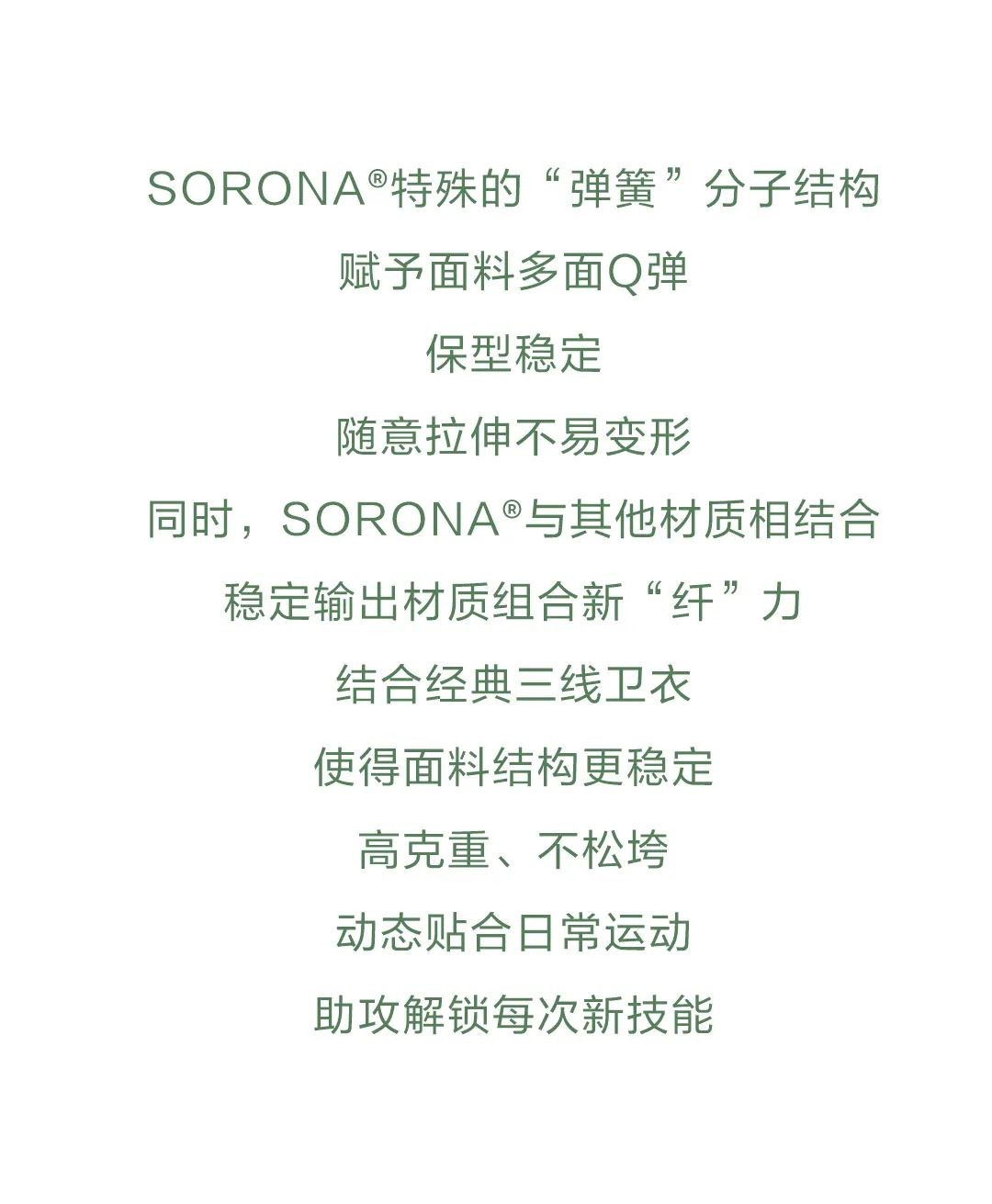 SORONA®是一项突破性的新型生物基聚合物解决方案,其核心原料来自每年可重复生长的植物。SORONA®不仅具有符合潮流趋势的可持续发展和环保主题,而且可以为纤维带来多种功能的优良特性。用SORONA®原料制成的纤维的“多功能性”为面料和服装设计师提供了更大范围的设计自由!