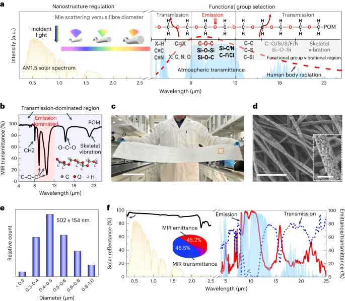 近日,清华大学与南京大学研究团队联合报道了一种聚甲醛(POM)纳米织物,它不仅实现了大气窗口(8~13μm)的选择性发射,而且还显示了剩余中红外波段的透射和太阳光(0.3~2.5μm)的反射,可在室外(晴天和阴天条件下)和室内(比典型纺织品低 0.5~8.8°C)实现高效的人体辐射冷却,为下一代智能纺织品的合理设计引入了新的可能性。