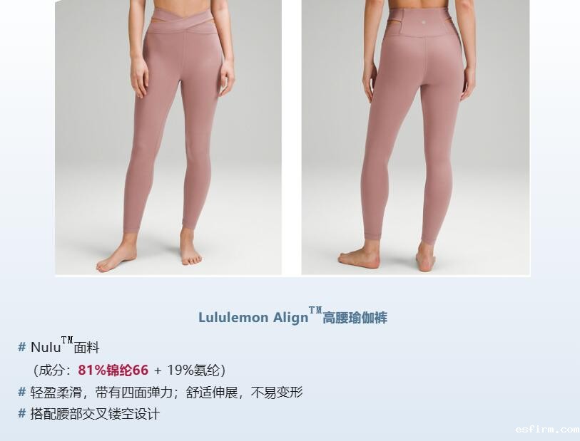 “裸感裤”AlignTM瑜伽裤是Lululemon品牌的核心热销产品之一,因其亲肤裸感、三角区无痕、弹力足、保型好,以及时尚设计,成为广大刘亦菲们入手leggings的第一选择。