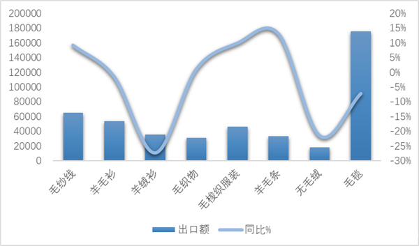 羊毛条、毛纱线、毛织物等出口继续保持增长,1~7月,三类毛纺产品累计出口额同比分别增长13%、9%和1%。针织服装与梭织服装的出口形势形成差异,1~7月,羊毛衫出口额同比下跌1%,毛梭织服装出口额同比增长10%。无毛绒和羊绒衫等两类主要羊绒出口产品前7个月的出口同比仍然疲软,出口额同比分别下滑21%和27%。