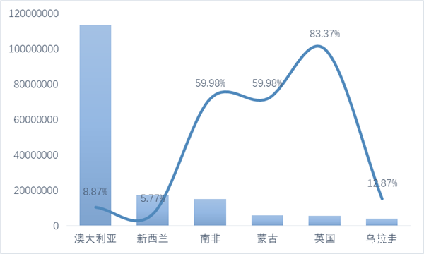 1~7月,毛纺原料与制品进口额23.6亿美元,同比下滑6.8%。其中,羊毛进口总额13.6亿美元,同比下滑4.2%,进口量17.9万吨,同比增长5.6%。澳大利亚、新西兰、南非的羊毛进口保持增长,增速分别为8.9%、5.8%及60%。