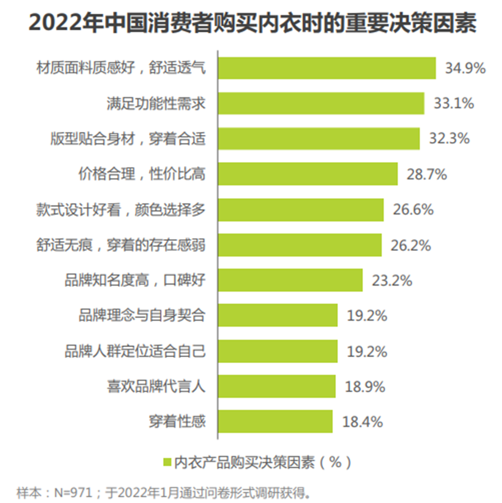 材质面料质感表现,是否舒适透气是中国消费者购买内衣时的首要决策因素。贴身衣物如果不够舒适亲肤,再多的功能性设计也难以提高穿着者的幸福指数。