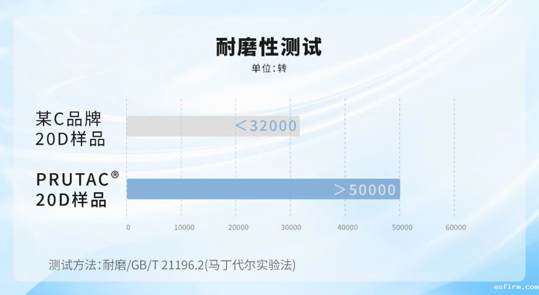 根据GB /T 21196.2 《纺织品 马丁代尔法织物耐磨性的测定》,相同组织下,PRUTAC®面料耐磨性能优于采样的某C品牌面料(该品牌面料以高耐磨性著称)。