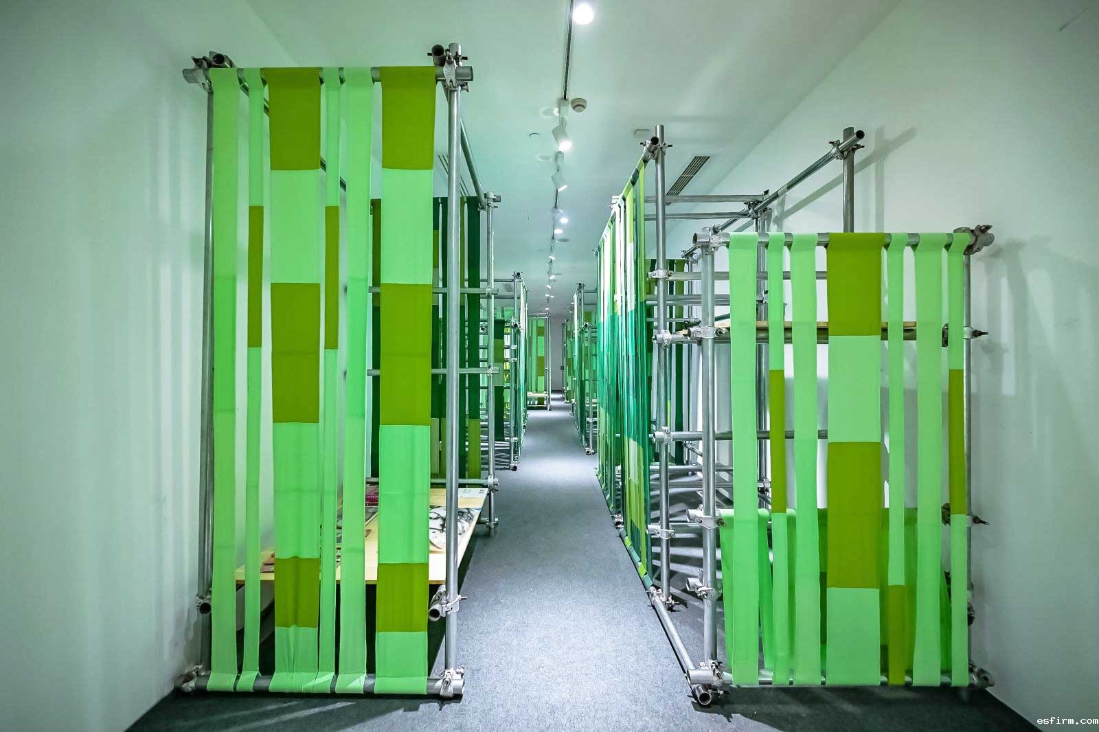 作为展览的压轴之作,解构与重组城市丛林的现代科技,不同材质、形态的旧椅子升级再造,能否令人回归于“人闲桂花落,青青山涧中”的向往?明暗相见的SORONA®生物基材料制成的面料结合回收脚手架结构,在明亮灯光的映射下,创造出一片静谧幽深的“竹径”。空间尽头设有休憩、阅读、陈列三个功能区域,其中阅读区陈列有SAME PAPER为本次展览特别提供的30本珍藏样书,让艺术感与实用性“相遇”,将自然与生活合二为一,徘徊在一段浸染了时间与记忆的共生情感间。