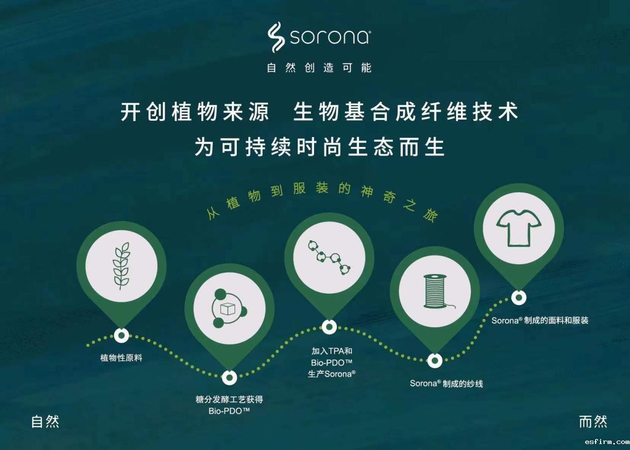 SORONA®是一项突破性的新型生物基聚合物解决方案,其核心原料来自每年可重复生长的植物。SORONA®不仅具有符合潮流趋势的可持续发展和环保主题,而且可以为纤维带来多种功能的优良特性。用SORONA®原料制成的纤维的“多功能性”为面料和服装设计师提供了更大范围的设计自由!