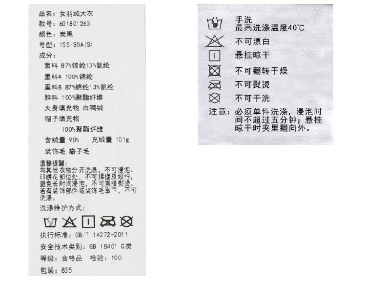 随着国内羽绒服产业的持续革新,羽绒服由单一的防寒保暖逐渐演变出防风、防水、透气等多功能诉求,其洗护需求条件也越来越高,经调研(5个品牌,252件热销羽绒服),现有的羽绒服洗护标签主要呈现出以下几个方面。