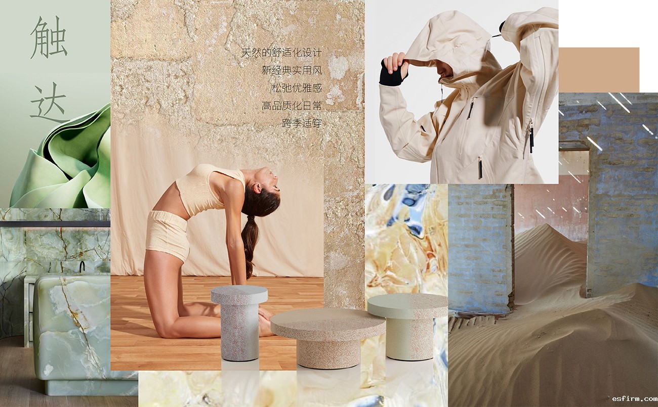 服装 & 材质:简洁浪漫且愉悦身心的色彩与质感营造轻松欢快的跨季节氛围,充满意趣的光泽、肌理和图案细节映射彰显自我的个性化审美。轻盈的光泽防水材料诠释时尚运动风潮,亮泽长丝纱、发光薄膜、胶质感水润表面等,适用于贴身层款式如瑜伽服,或外套类,打造科技感浪漫造型;具有防风雨、保暖、调温、透气等性能的涤纶、尼龙面料,关注环保属性和悦动色彩,打造活力都市、休闲、户外皆宜的跨场景品类;薄透面料如轻盈薄纱和经编科技感网眼针织,隐约的透视感是关键,是重要的跨季和层搭材质;结构紧凑且具有柔糯触感的针织面料带来冬季疗愈感;适度的图案设计丰富产品外观,吸引年轻态消费者。
