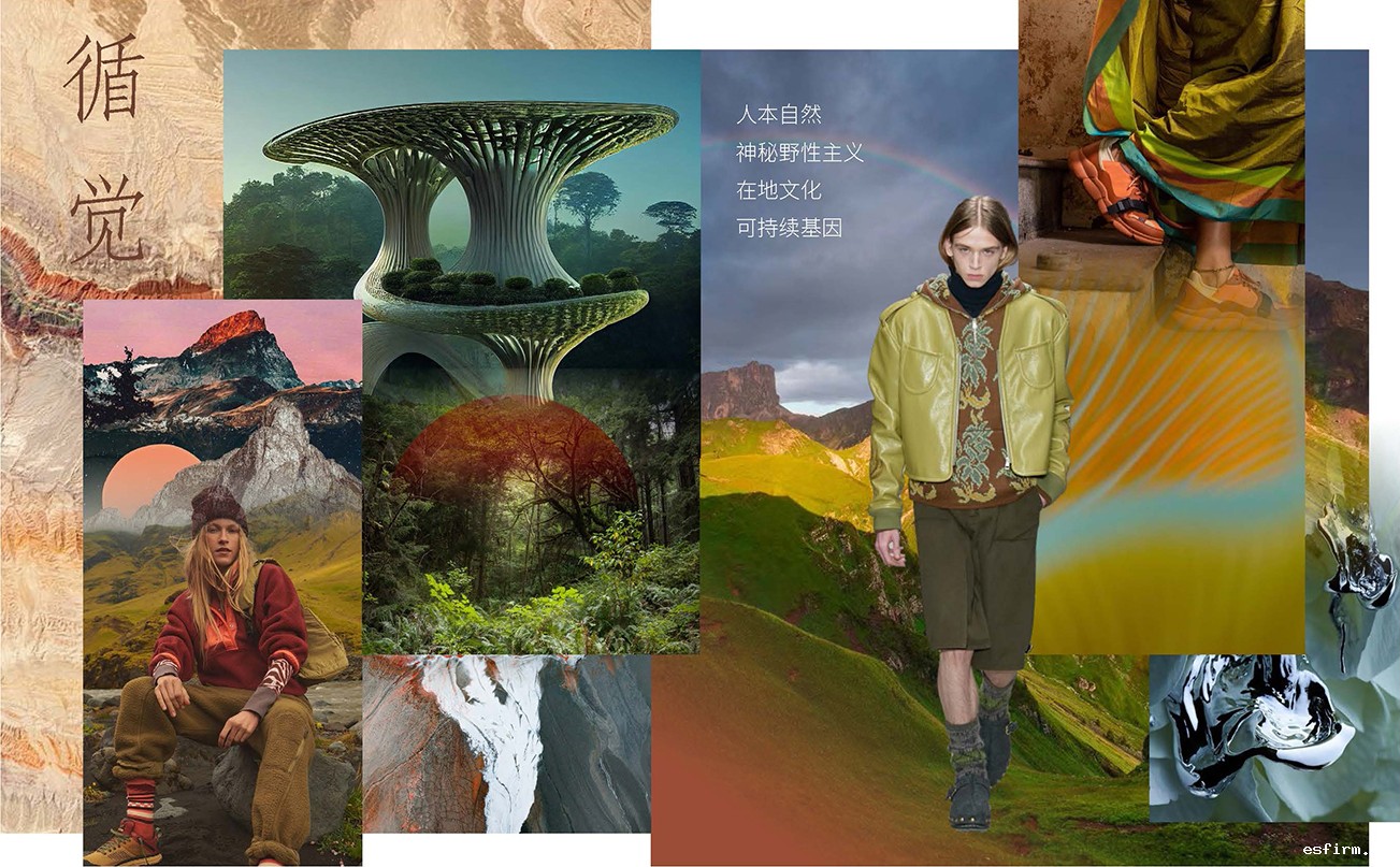 服装 & 材质:新自然风格蕴藏着野性之美与可持续力量,性能美学融入跨场景日常,带来多重体验。升级户外质感依然重要,运动羊毛环保且带有保暖透气、抗皱、机可洗等功能,演绎温暖奢华的都市户外风;实用的密实斜纹布、尼龙布、帆布等基础防护材质聚焦可持续升级,环保的原料和防水及染色工艺、植物基功能整理是突破关键;超强性能如非氟碳系拒水绒 Downtek PFC free ™、再生尼龙 6.6、Dyneema 特种纱等,提升耐用强韧性能;泥土、根系、岩石灵感启发下,面料呈现出不规则划痕和有机干燥肌理,天然纤维、负责任动物纤维与再生纤维混纺提升舒适性与功能性;应用扎染、提花针织或环保混色纱等烘托浪漫的自然主义氛围。一切源于自然,融于自然。