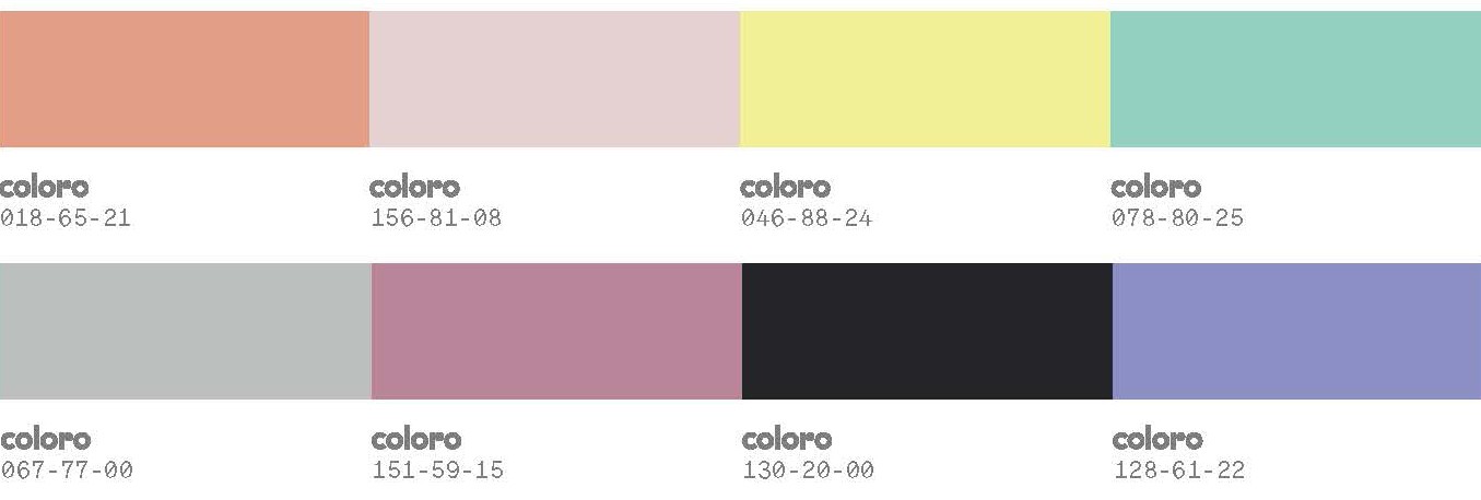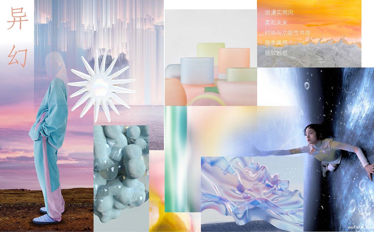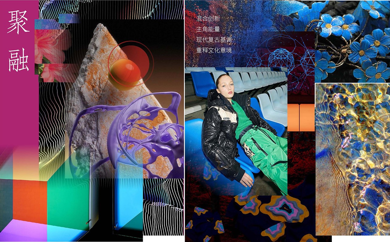 色彩:缤纷彩色以梦幻的形式绽放,元气粉、柔和亮黄与青薄荷色打破冬日印象,描绘出活力生机的多彩意象。樱草紫、薰衣草色穿插银河灰,折射未来绮光,触发奇幻美学体验。