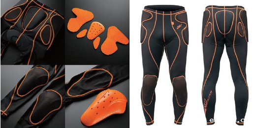 由于护具产品在使用过程中存在损坏现象,为方便更换,大多数关节护具会通过插片的形式与服装结合。某些品牌会设计相应的紧身衣,在特定部位设置内插口袋,填充垫片进去。紧身衣对身体具有优良的包裹性,可增加护具与身体的贴合度。
