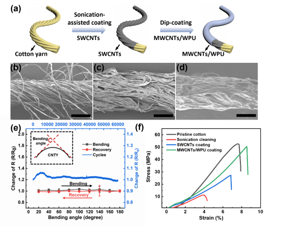 相关测试结果表明,碳纳米管不仅大量负载在棉纱内部,而且在棉纱表面形成了致密的导电网络;由于引入了水性聚氨酯,经过6万次不同角度的循环弯曲试验后,碳纳米管复合纱线的导电性能不变。因此,通过该工艺不仅有效提升了碳纳米管的附着稳定性,而且保持了复合纱线良好的机械拉伸性能。