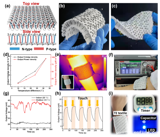 研究人员利用制备的热电纱线构筑了全柔性、具有优异热电转化效果的尺寸为8.5cm×5.5cm×1.0cm的热电织物,并探究了其在实际应用中的效果。结果表明,在室内与户外的实际穿戴过程中,该热电织物可以在人体手臂有效构建温差并实现了20~45mV的电压输出,表明其可以有效收集人体热能,而且热电织物的收集效率与穿戴所处的环境有一定的关系。另外,热电织物的电压输出与其上下表面温差有关,因此可用于环境温度监测中触觉传感器;在升压电路的辅助下,热电织物也可以收集人体热能从而直接驱动计时器和LED灯。