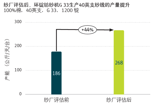 这提高了转杯纺纱机和环锭细纱机的速度和效率。在不影响成纱质量的情况下,将32英支转杯纱的产能提高70%(图1),将40英支环锭纱的产能提高44%(图2)。最终机器产能和性能的提升超出了客户的期望。