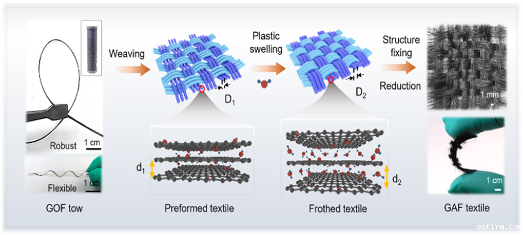 研究人员基于成熟塑化拉伸技术制备了高取向的氧化石墨烯纤维,并将纤维丝束编织成织物,通过溶剂进行塑化溶胀,对溶胀的氧化石墨烯凝胶纤维织物进行预还原、冷冻干燥和高温还原处理,最终获得石墨烯气凝胶纤维织物。