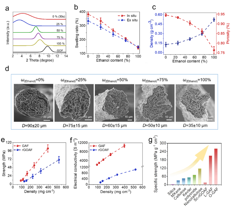 基于塑化溶胀机理,通过调节塑化溶胀浴的组成,即改变溶剂的极性,可以有效调节氧化石墨烯凝胶纤维的溶胀率,进而大范围调控气凝胶纤维的密度、孔隙率等结构参数,突破了传统液晶纺丝法的密度限制。经过化学还原和高温热处理后,随着密度增加,石墨烯气凝胶纤维的力学强度和导电率逐步提升,单根石墨烯气凝胶纤维的力学强度最高可达103 MPa,导电率可达1.06×104 S/m。