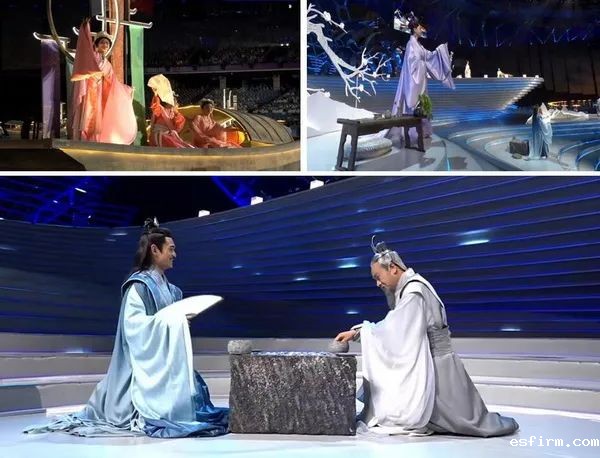 作为本次亚运会开幕式的开场,“国风雅韵”篇主要表现宋代的风雅生活、诗意山水以及薪火相传、万家灯火的繁华景象。“国风雅韵”篇主要分为三个部分:水墨入诗画、烟雨染江南、灯火耀古今。