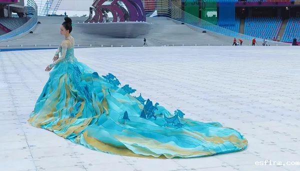 开篇「水墨入诗画」,巨大的圆形地屏呈现俯瞰祖国壮美山河的景象,高科技的地屏和3D裸眼技术,让人身临其境,醉入其中。领舞演员身着以渐变的晕染形成温润如玉、青绿交辉的色彩的名为“水天碧”的长裙,伴着优美的旋律在生机盎然的山水间翩翩起舞;身着水墨袍服的少年伴舞,与其相和,英姿勃发,身姿潇洒,掀起了开幕式表演的一段高潮。