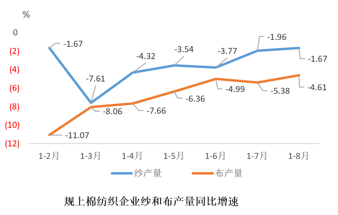生产稳步推进,纱和布产量降幅继续收窄。据国家统计局数据,1-8月份,规模以上棉纺织企业纱和布产量累计同比分别下降1.67%和4.61%,降幅较1-7月份分别收窄0.29和0.77个百分点。