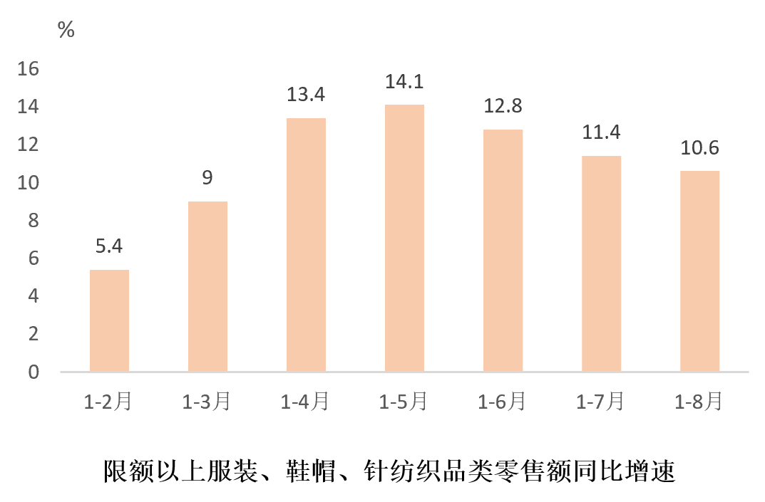 国内终端纺织品消费持续恢复。据国家统计局数据,1-8月份,限额以上服装、鞋帽、针纺织品类零售额同比增长10.6%,增幅较1-7月份下降0.8个百分点,高于社会消费品零售总额7.0%的增速。1-8月份,全国网上零售额同比增长12.1%,较1-7月份回落0.4个百分点。实物商品网上零售额增长9.5%,其中,穿类商品增长10.9%,增幅较1-7月份收窄1.1个百分点。