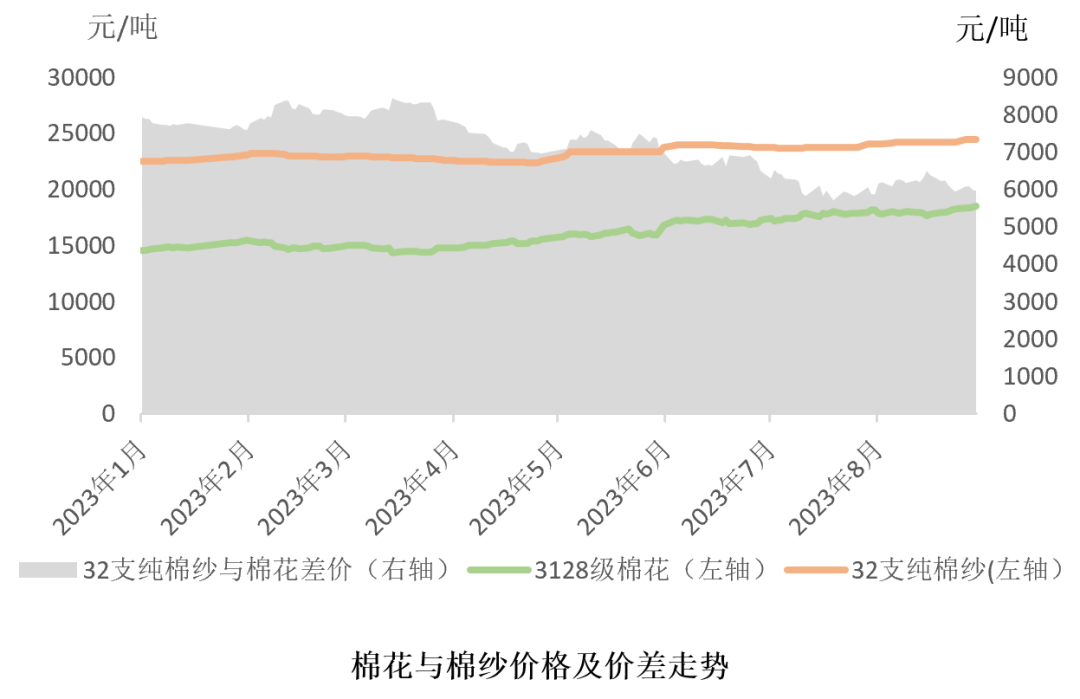 国内外棉花价格依然呈现外弱内强格局,国内棉花价格小幅上涨,下游棉纱和棉布价格提涨困难。8月份,市场购销整体气氛偏弱,销售不畅,成交价格稳中偏弱,中下旬棉布销售略有改善,但价格平稳。以普梳32支纯棉纱与3128B标准级棉花的价差为代表,8月份花纱价差缩小至6000元/吨左右,按照即期利润,企业仍处于亏损状态。