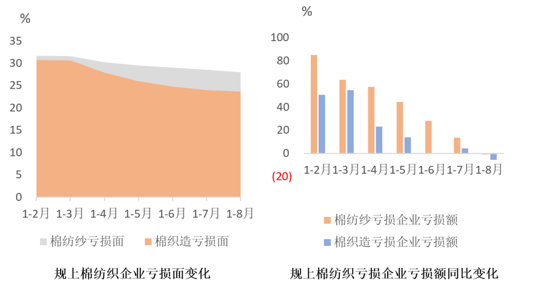 棉纺织行业主要经济指标降幅收窄,企业效益逐步改善。据国家统计局数据,1-8月份,规模以上棉纺纱企业营业收入同比下降7.85%,降幅较1-7月份收窄0.59个百分点,利润总额同比下降28.35%,降幅较1-7月份收窄11.3个百分点,亏损面27.99%,较1-7月收窄0.58个百分点;棉织造企业营业收入同比下降7.35%,降幅较1-7月份收窄0.93个百分点,利润总额同比下降19.30%,降幅较1-7月份收窄2.69个百分点,亏损面23.69%,降幅较1-7月份收窄0.3个百分点。但是,规模以上棉纺纱和棉织造业营收和利润指标均显著弱于全国规模以上工业企业和纺织行业,亏损面仍处于较高水平。