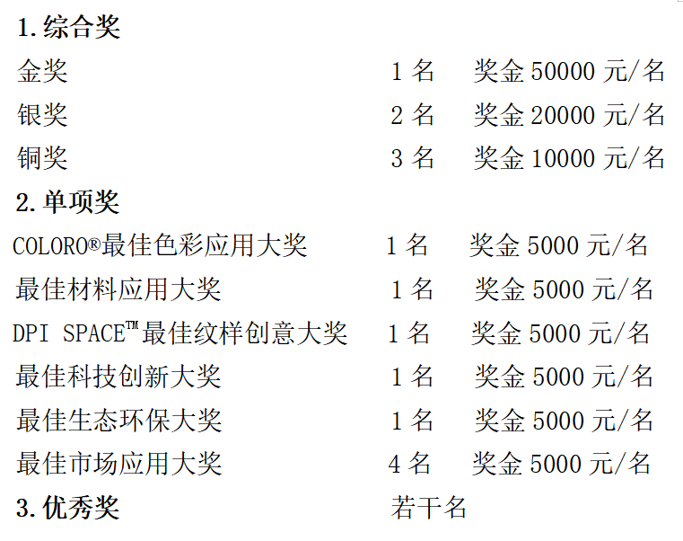 赛事设立“综合奖”、“单项奖”和“优秀奖”。其中最佳色彩应用大奖由中国应用色彩体系 COLORO®冠名,最佳纹样创意大奖由人工智能图案创意设计平台 DPI SPACE™冠名。