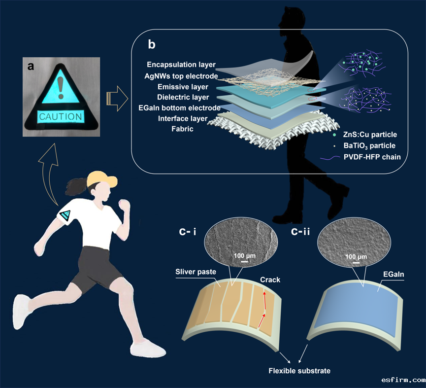 受到纺织数码喷墨印花技术的启发,浙江理工大学胡毅教授团队提出一种简单的全喷涂方法在纺织品上制造ACEL器件。所制备的ACEL器件由织物、界面层、共晶镓铟合金(EGaIn)底电极、介质层、发光层、银纳米线(AgNWs)顶电极和封装层组成。具有本征流动性的EGaIn能够顺应器件的形状变化,有效抵抗裂纹扩展,大大提高了其抗机械变形的电稳健性。