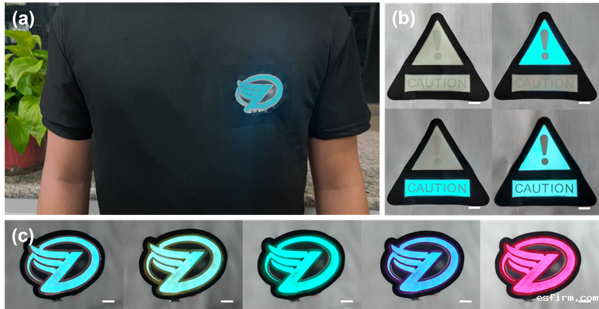 由于全喷涂ACEL器件可以成功地在织物上制备,并且具有很好的柔韧性和稳定性,进而研究团队制作了图案化的ACEL器件作为织物显示器。考虑到实际应用中经常要求发光织物具有多种颜色,他们使用不同颜色的透明TPU薄膜进行器件封装,使发光图案丰富多彩。