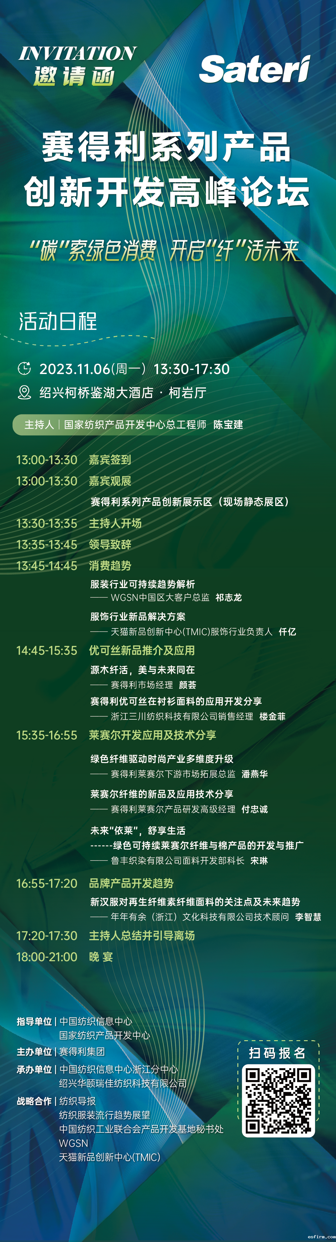 问渠那得清如许?为有源头活水来。作为整个纺织服装行业的源头,绿色纤维处于产品生命周期的初始阶段,既发挥着引领产业链技术创新与价值创造的关键作用,又承载着推动行业可持续发展的重要期望。11月6日,2023赛得利系列产品创新开发高峰论坛将于浙江绍兴柯桥举行。如何在“双碳”大潮中逐浪前行,让一根纤维链动起绿色低碳消费?这场论坛的精彩内容将给出答案。
