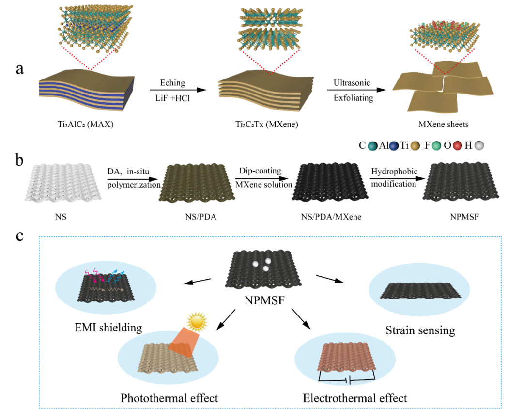 通过刻蚀Ti3AlC2得到单层MXene 纳米片,将其包覆在聚多巴胺改性的纤维表面,构建完整的MXene导电网络。进一步对纤维表面的MXene导电层进行疏水改性,使导电织物具有超疏水能力。开发的多功能、超疏水智能织物不仅对微小形变能够识别,也能够实现人体热量供给和电磁波辐射的拦截,拓宽了其多样化的工作环境。