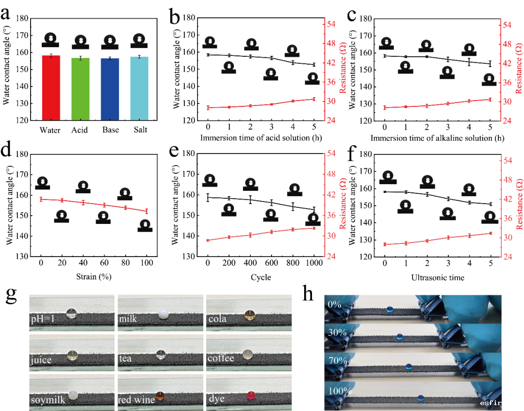 基于MXene导电材料制备的多功能智能织物对酸、碱和盐溶液都具有超疏水能力,最高接触角可达158 ℃,即使进行长达5 h的酸、碱溶液处理,智能织物依然能够实现超疏水,保持较小的电阻波动,在经过1000次拉伸循环测试后仍保持超疏水状态,这主要归功于疏水层良好的稳定性以及对MXene导电层的保护作用。这样的多功能超疏水智能织物不仅能够抵抗化学溶液的腐蚀,也能够抵抗机械外力的干扰,使其应用环境更加广泛。