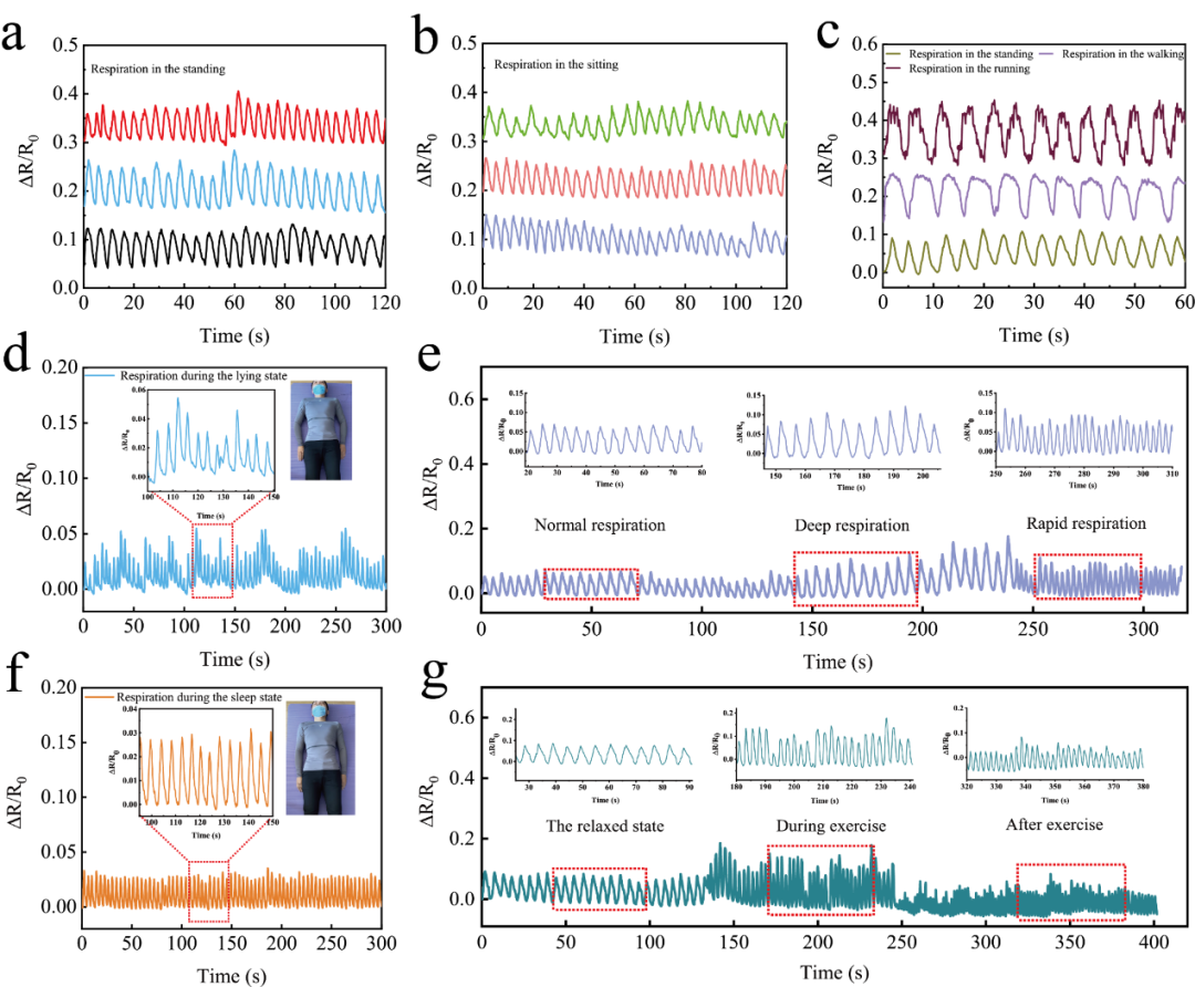 作为应变传感器,多功能超疏水智能织物具有良好的传感性能。研究表明,超疏水织物传感器可以收集不同运动状态下的呼吸信号和呼吸频率(13-15 times/min),实现了对人体不同运动姿态的辨别。另外,超疏水智能织物能够监测不同睡眠状态下的呼吸信号,并且可以准确地判断睡眠者的入睡程度,有望用于呼吸疾病的诊断和预防。