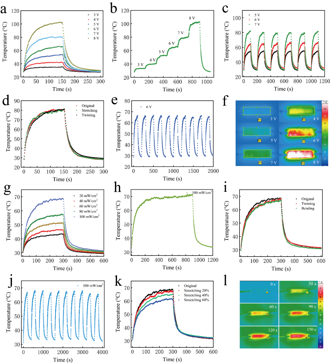 由于MXene纤维导电网络以及MXene材料广泛的太阳光谱吸收和局域表面等离子体共振(LSPR)效应,超疏水智能织物表现出令人满意的电/光热转换能力。在8 V的安全电压下,超疏水智能织物表面温度可以达到102.3 °C。
