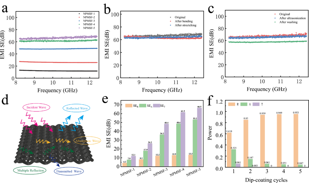 此外,在X波段(8.2-12.4 GHz), 超疏水智能织物拥有显著的电磁屏蔽效率,最高可达66.2 dB,远高于商用标准(20 dB)。在经过反复弯曲和拉伸后,超疏水智能织物的电磁屏蔽能力没有明显的衰弱,证明了其良好的机械稳定性。经过洗涤后的超疏水智能织物仍保持较高的电磁屏蔽效率,这归功于智能织物优异的疏水表现。因此,设计的超疏水智能织物在电磁屏蔽方面表现出潜在的发展前景。
