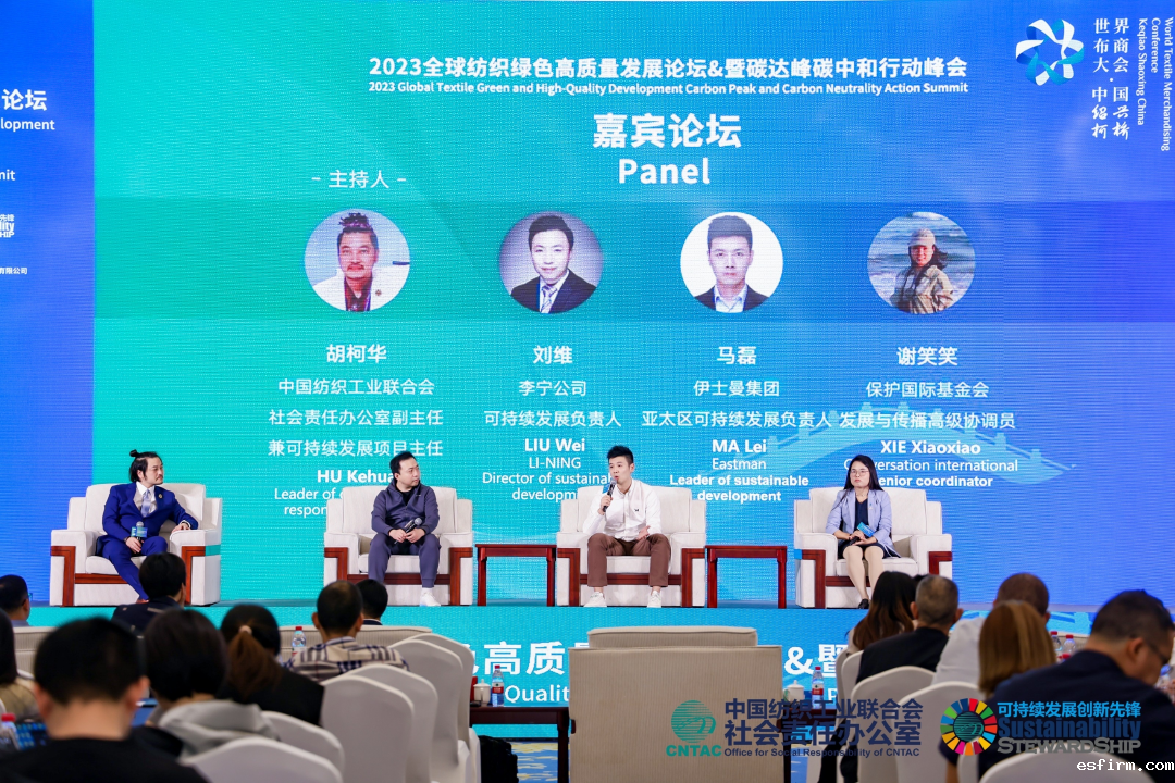 在最后的嘉宾论坛环节,来自李宁公司的可持续发展负责人刘维、伊士曼集团亚太地区可持续发展负责人马磊、保护国际基金发展与传播高级协调员谢笑笑共同探讨了纺织产业链上下游在可持续发展方面的进展与挑战。刘维介绍了李宁公司自创办以来在可持续发展方面的丰富经验,代表品牌端提出目前在循环经济方面遇到的挑战。马磊向大家介绍了伊士曼目前已经成功商业化应用的新材料技术,其中“碳再生”技术引起了与会代表队浓厚兴趣。谢笑笑分享了与开云集团合作的基金项目在应对气候变化及生物多样性保护方面的进展。他们一致认为,面对全球气候变化的严峻挑战,纺织行业需要积极行动,推广绿色生产方式,实现碳达峰碳中和的目标。同时,企业与行业协会、非政府组织等需要在技术创新、政策制定、产业链合作等方面加强合作,共同推动行业的可持续发展。