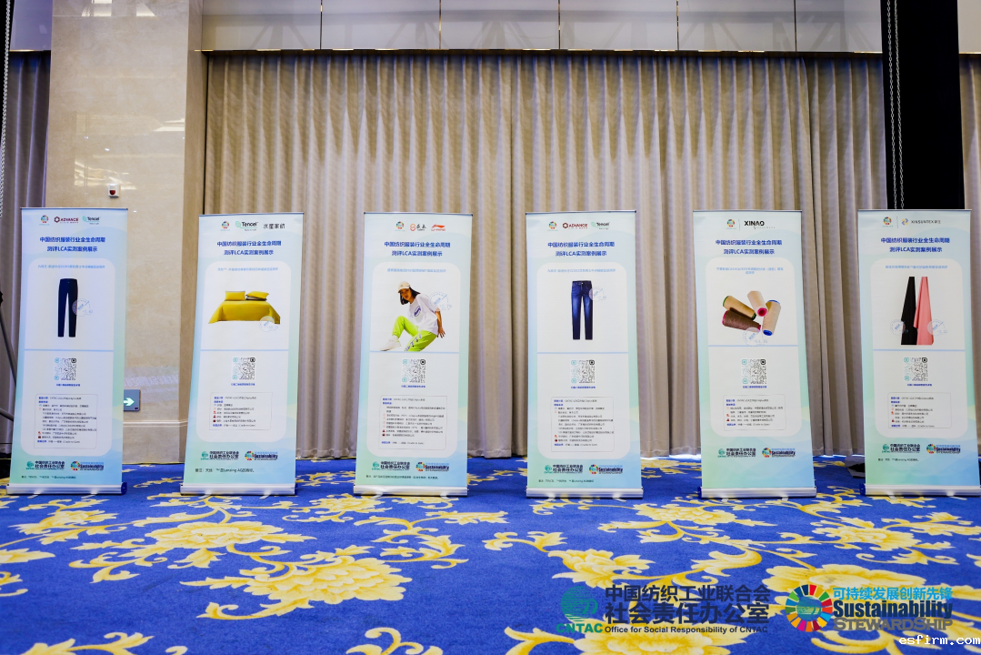 会场两侧展示了CNTAC-LCA工作组的碳足迹测评案例,这些案例涵盖了童装、牛仔裤、西装、家纺等不同纺织产品的实测碳足迹,为其他企业和产品提供了参考和启示。通过这些案例,与会者可以更直观地了解碳足迹测评的方法和实际应用,进一步推动行业的低碳发展。