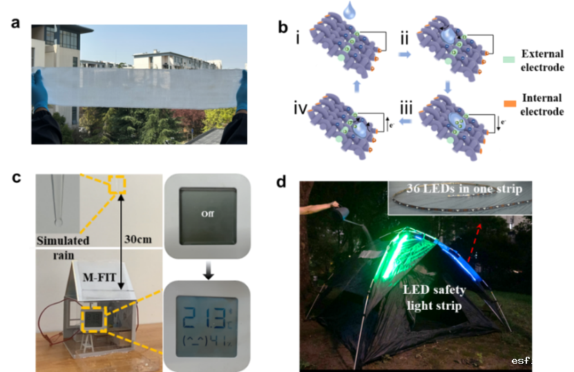 此外,研究人员在M-FIT中引入导电纱线作为外电极,当织物与液体接触时,可将传统的固液界面效应转变为体效应,实现有效的水滴能量收集。通过模拟M-FIT作为能源织物在户外场景中的应用发现,当模拟降雨的液滴作用在能源织物表面时,织物可产生电能,实现对小型电子器件(如温湿度计、LED安全灯带)的持续供电。