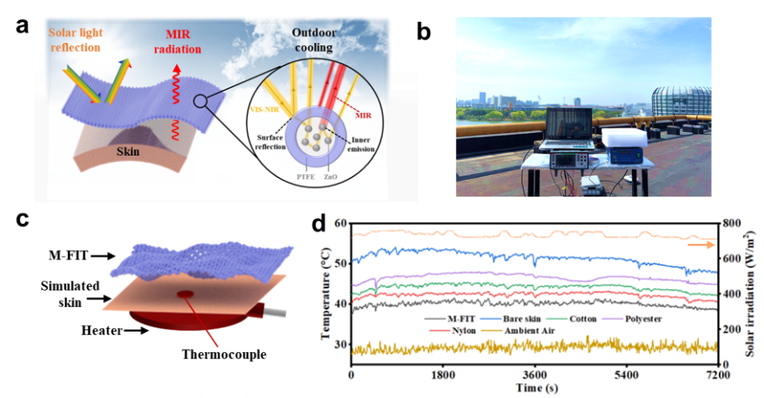 与商用棉织物、涤纶织物和尼龙织物相比,M-FIT在中红外波段具有更高的发射率(94.23 %)、在可见光波段具有更高的反射率(89.15 %),因此,可以有效地管理皮肤表面温度。在太阳辐照强度约为740 W/m2的晴朗天气下,相比于其他织物,使用M-FIT遮盖的(模拟)皮肤温度降低了2~12 ℃。