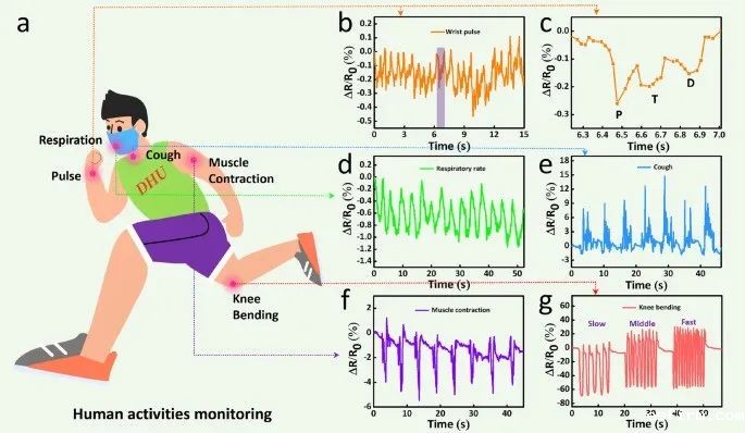 研究人员将该压力传感器固定于人体身体的不同部位,成功获取了人体生理信号(如脉搏、呼吸频率和咳嗽)和运动信号(如肌肉收缩和膝关节弯曲)。