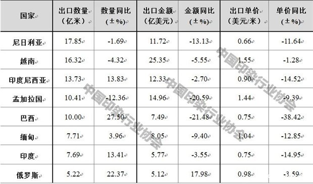 从主要出口国家来看,我国印染行业出口市场多元化的特征更加明显。越南、孟加拉国作为仅次于中国的两大服装出口国,对我国印染面料需求较大,今年以来,受欧美市场需求收缩影响,越南、孟加拉国从我国进口印染面料数量有所下降,前三季度,我国印染八大类产品对越南、孟加拉国出口数量同比分别减少4.32%和12.36%。但同期对印度尼西亚、巴西、印度、俄罗斯出口实现较快增长,增速明显高于出口平均增速,这对我国印染行业出口规模保持稳定起到了一定的支撑作用。