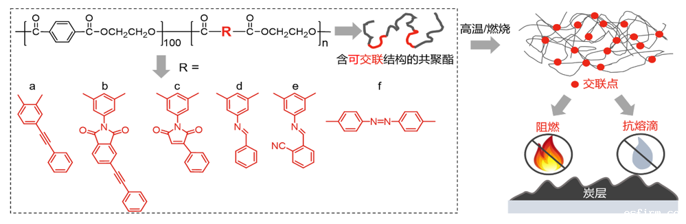 目前对聚酯纤维的传统无卤阻燃方法是通过引入含磷阻燃剂,以促进熔滴而增加聚酯纤维表面的物质损耗和热损耗的方式达到阻燃效果,但会导致熔滴现象更严重。此外,这种含磷的聚酯纤维与具有燃烧时易发生炭化的纤维如棉纤维混纺时,会因“机理相克”而导致阻燃失效,限制了其应用。因此,解决聚酯阻燃与抗熔滴之间的矛盾是阻燃领域长期没有解决的技术难题。四川大学王玉忠院士致力于聚酯不熔滴阻燃技术的研究,其团队通过在聚酯大分子链中引入交联基团,在大分子合成和熔融成型加工温度下不交联,而在高温或燃烧时可迅速自交联,从而实现了聚酯的高温不熔滴和炭化阻燃,该方法突破了传统反应型阻燃剂对卤素的依赖。